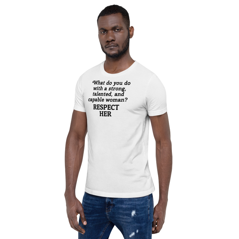 So, what do you do with a strong, talented, and capable woman? Why, respect her, of course! Keep It Fun while showing your love of women with this specialty tee. Made of 100% cotton, this lightweight t-shirt feels soft and has just the right amount of stretch. The unisex cut makes it comfortable and flattering to both women and men. All our t-shirts are made of pre-shrunk fabric and have shoulder-to-shoulder taping.